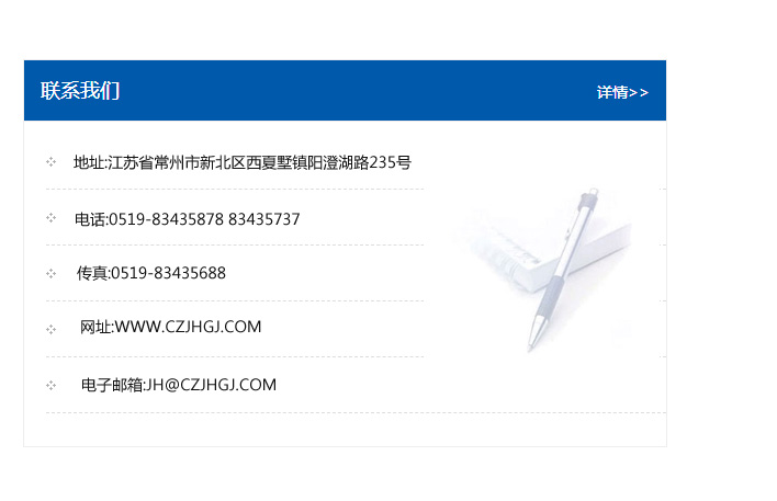 地址:常州市新北區友邦商務大廈1幢16、17層  電話:0519-85101652  傳真:0519-85112595  郵編:213022  網址:www.cz-jiayue_cn.22wi.com  郵箱:xiajifengaa@163.com